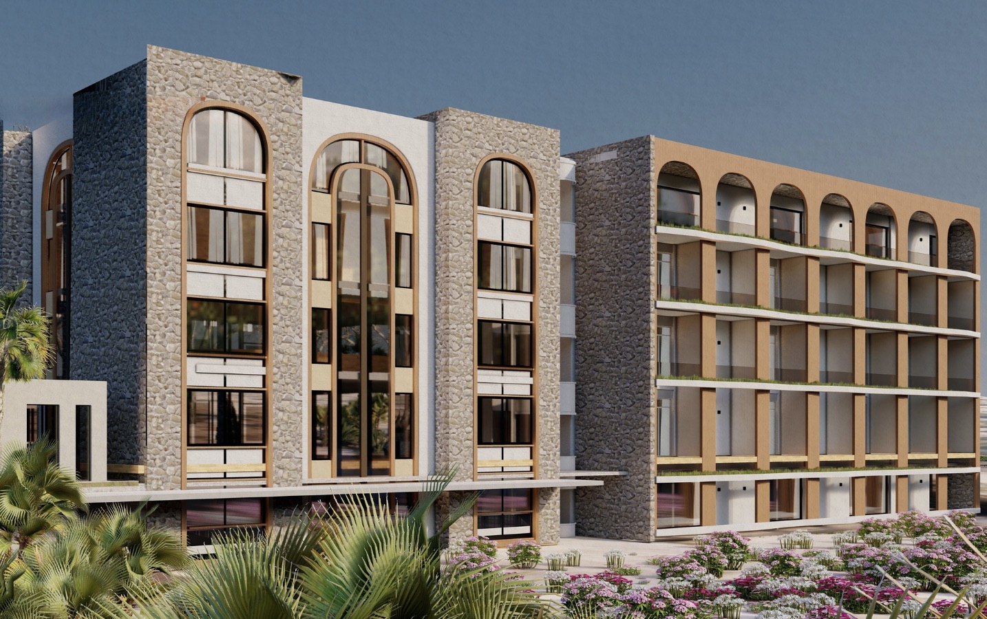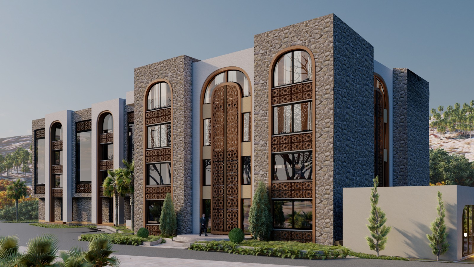 مستوحى من العمارة الحجازية التقليدية و يضم نوافذ مقوسة، واجهات حجرية طبيعية، وتوزيع متماثل، مدمج مع عناصر عصرية مثل الخطوط النظيفة، الألواح الزجاجية الواسعة، والهندسة البسيطة